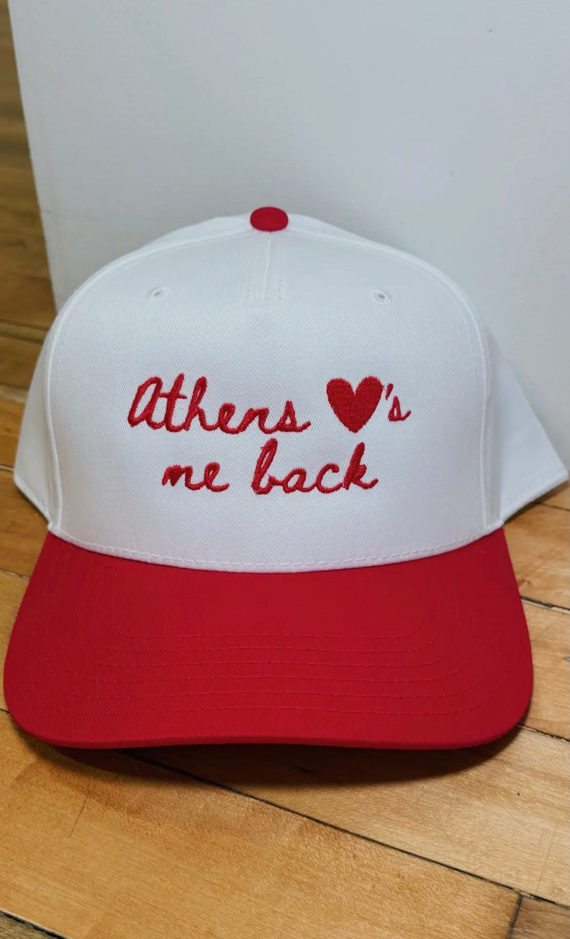 The Athens Loves me Back Canvas Hat from La Fête Goods is a perfect accessory for all women who want to add a touch of chic to their outfit. This baseball cap is a unique design by the creative sister duo, Mikey and Perra. It's a funky twist on the everyday cap that's sure to brighten up your day!