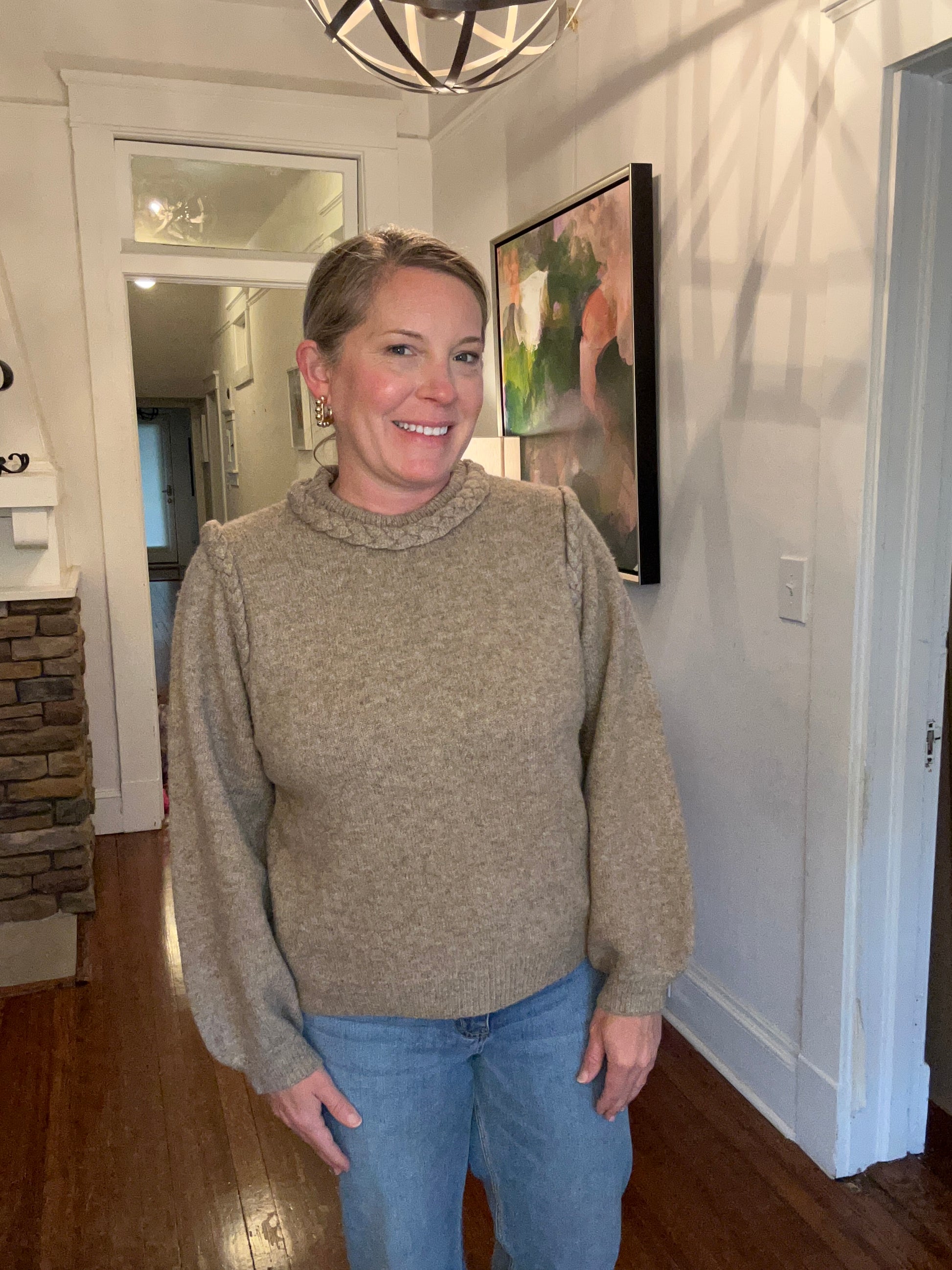 Solid long sleeve round neck knit sweater featuring braided detail. Unlined. Knit. Non-sheer. Lightweight.