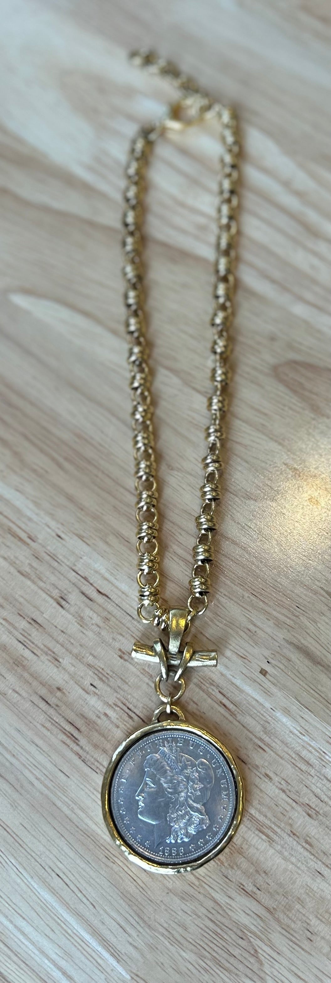 Elevate your look with this stunning vintage-inspired necklace featuring a replica Morgan Silver Dollar pendant. The bold, gold-toned beaded chain adds rich texture, while the hammered bezel and toggle detail bring a touch of old-world charm.