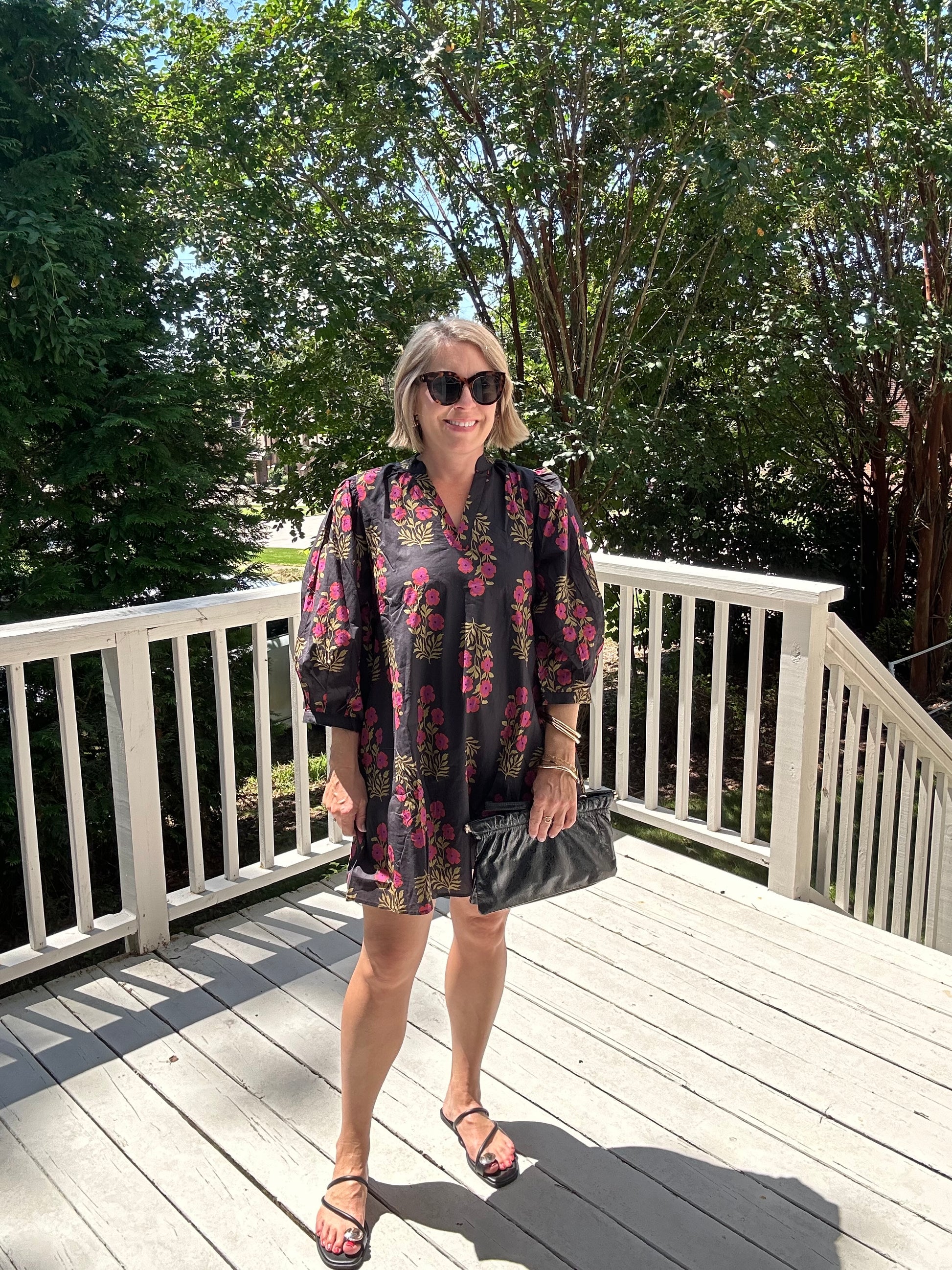 Floral pattern V-neck band collar mini dress featuring ¾ band puff sleeves. Side pockets. Lined. Woven. Non-sheer. Lightweight.