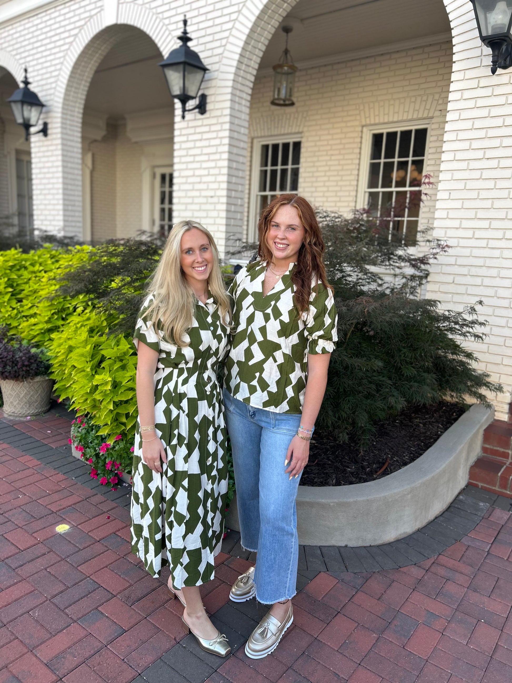 Make a bold statement with this THML Geometric Button Down Maxi Dress. Featuring an eye-catching green and white abstract pattern, this dress combines a modern print with a timeless silhouette. Designed with a collared neckline, button-down front, and short sleeves, it offers effortless sophistication. The flowy maxi length and relaxed fit make it perfect for all-day comfort, while the gathered waist adds a flattering touch. Style it with sandals for a casual day out or dress it up with wedges and accessories for a chic look.