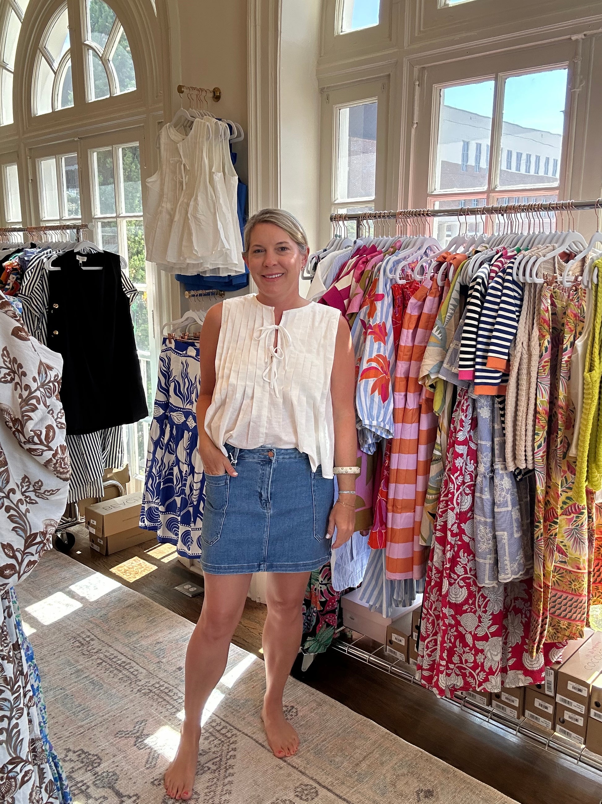 Comfort stretch denim, high rise waist, cargo mini skirt