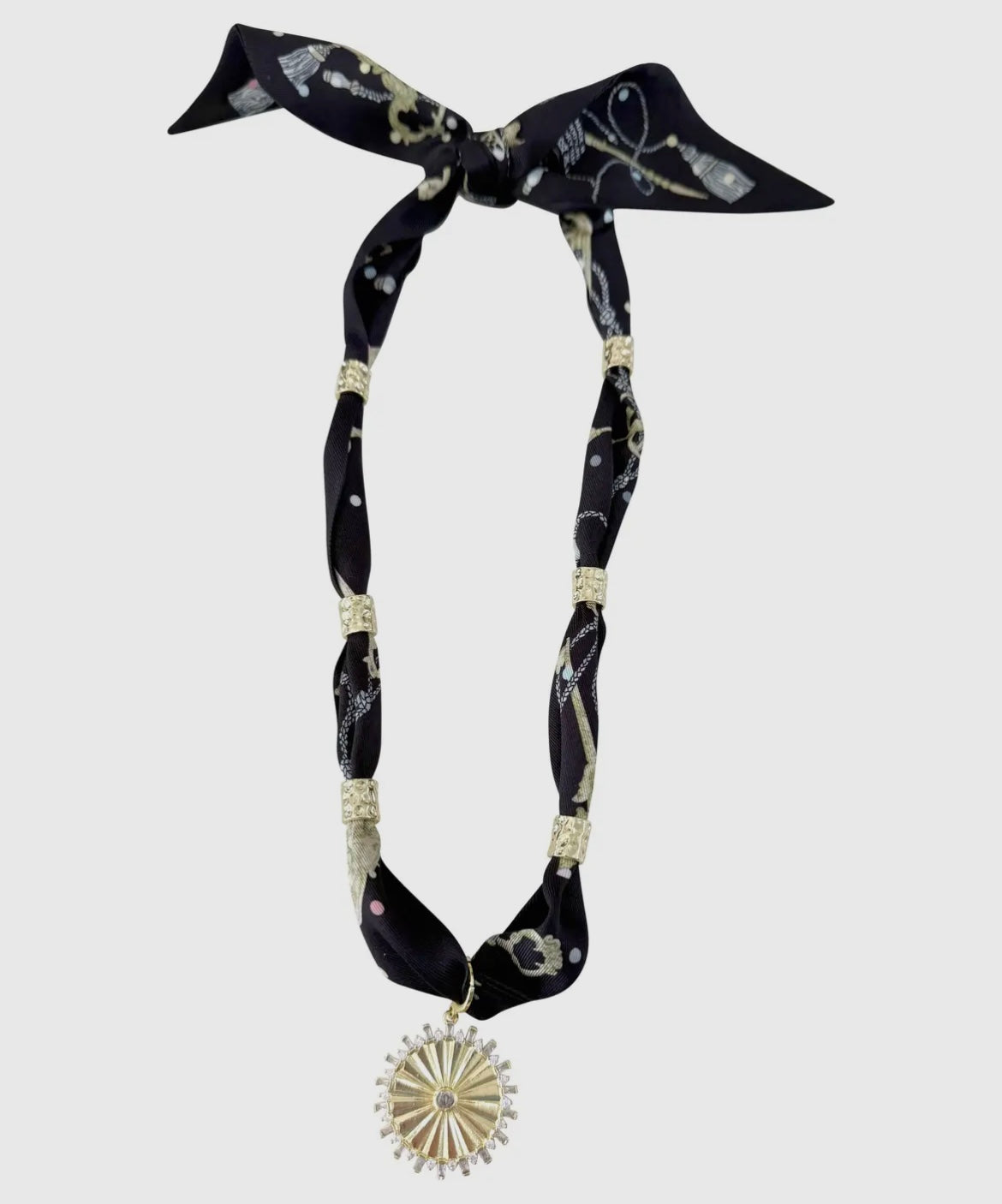This stunning piece features a silky scarf adorned with gleaming 18K gold bezel accents and a striking