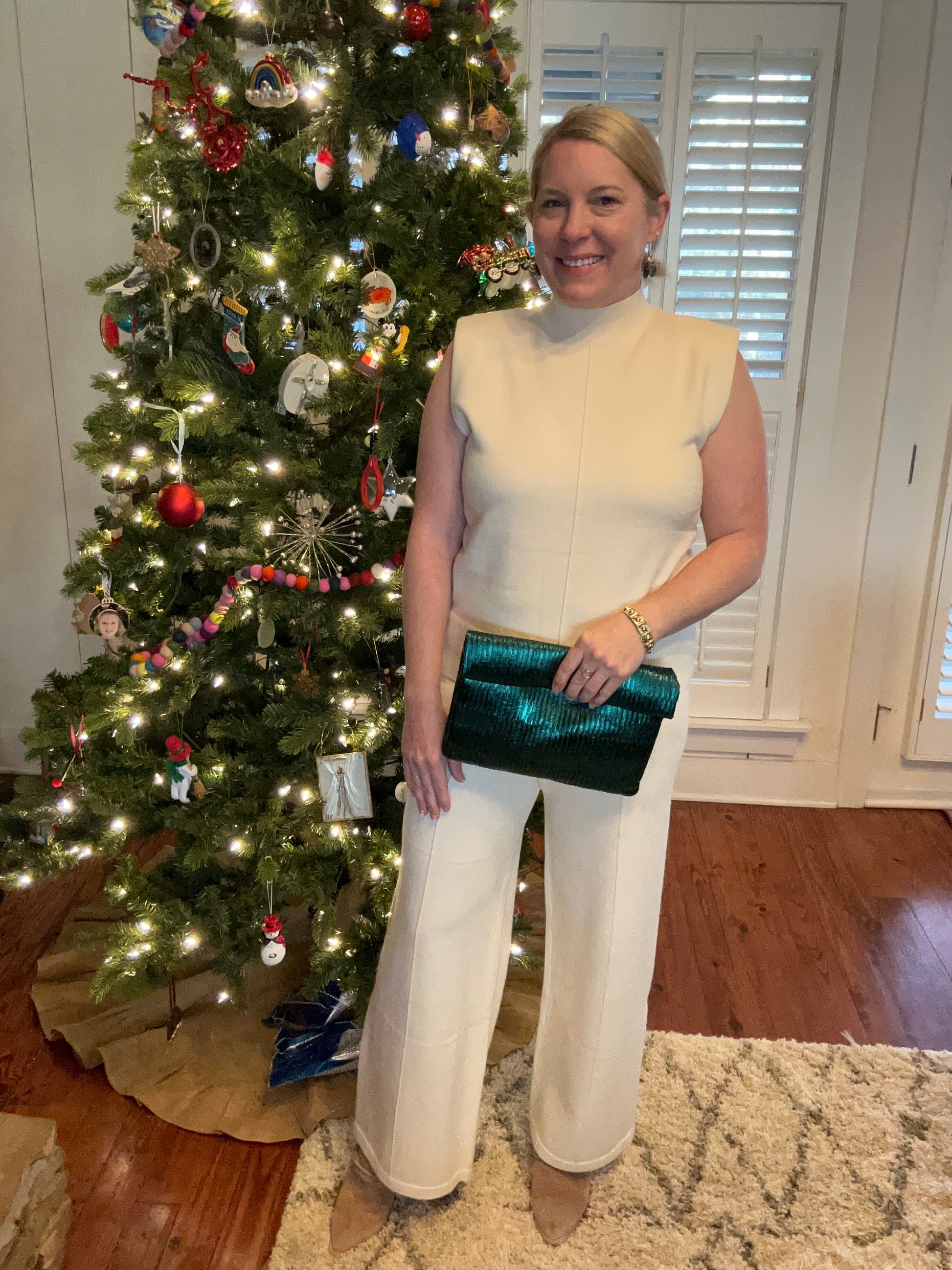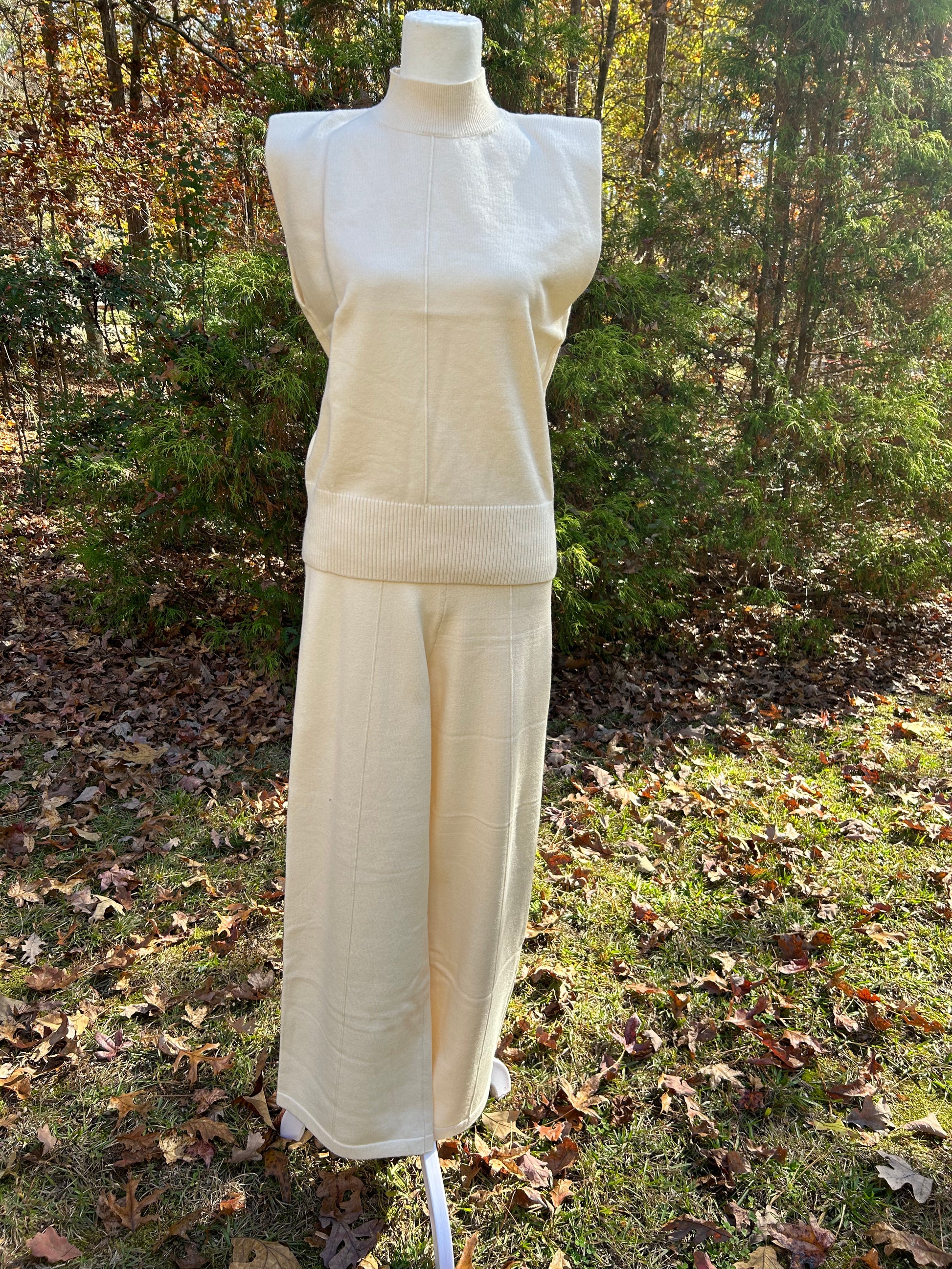 The most comfortable set you can add to your closet! You can definitely dress up or down with sneakers or boots. These cropped pants are made from a stretch knit fabric. The sleeveless top is super soft with a mock neck.
