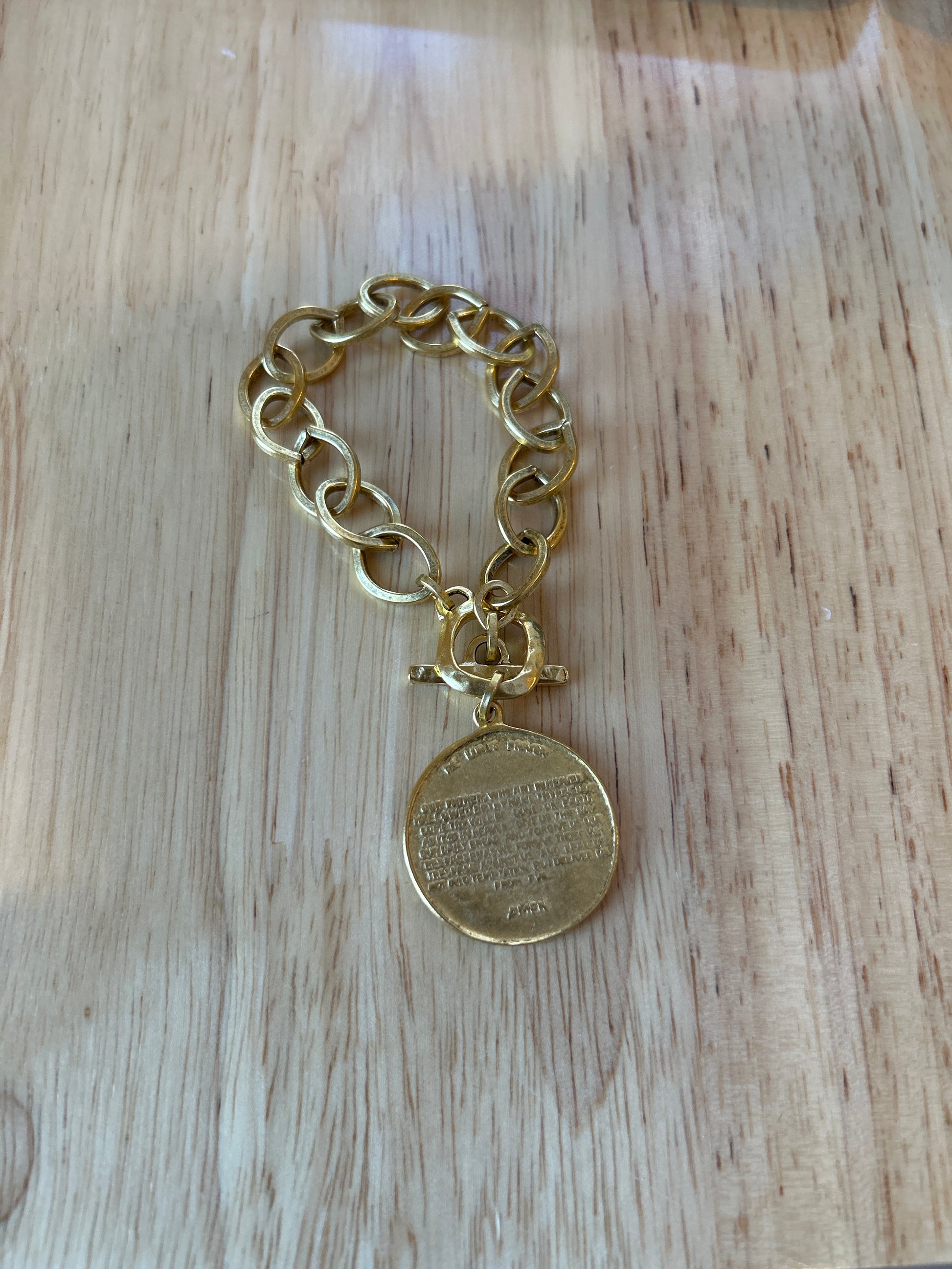 Chain link bracelet with the Lord’s Prayer on one side and a cross on the other! Toggle closure.