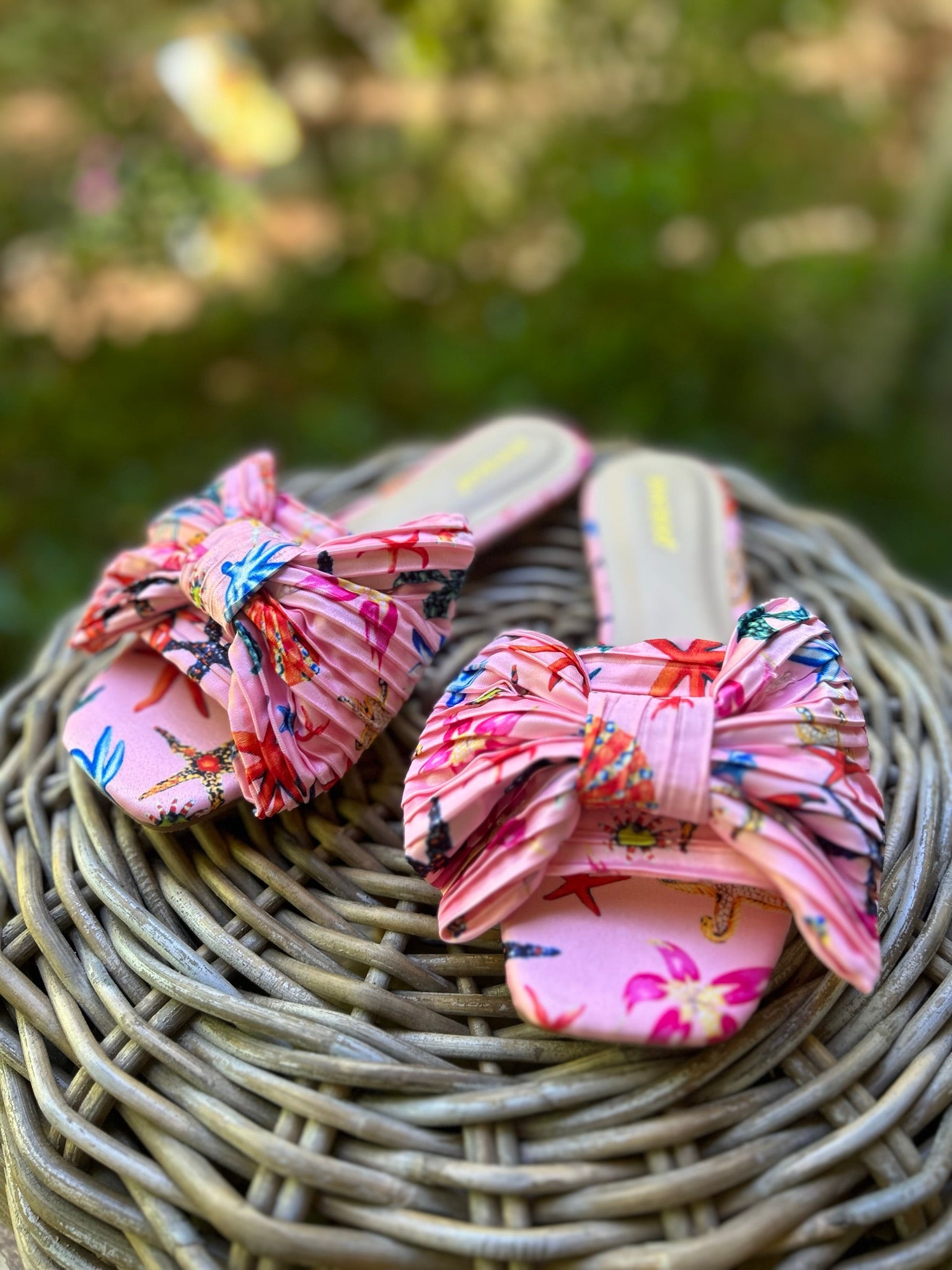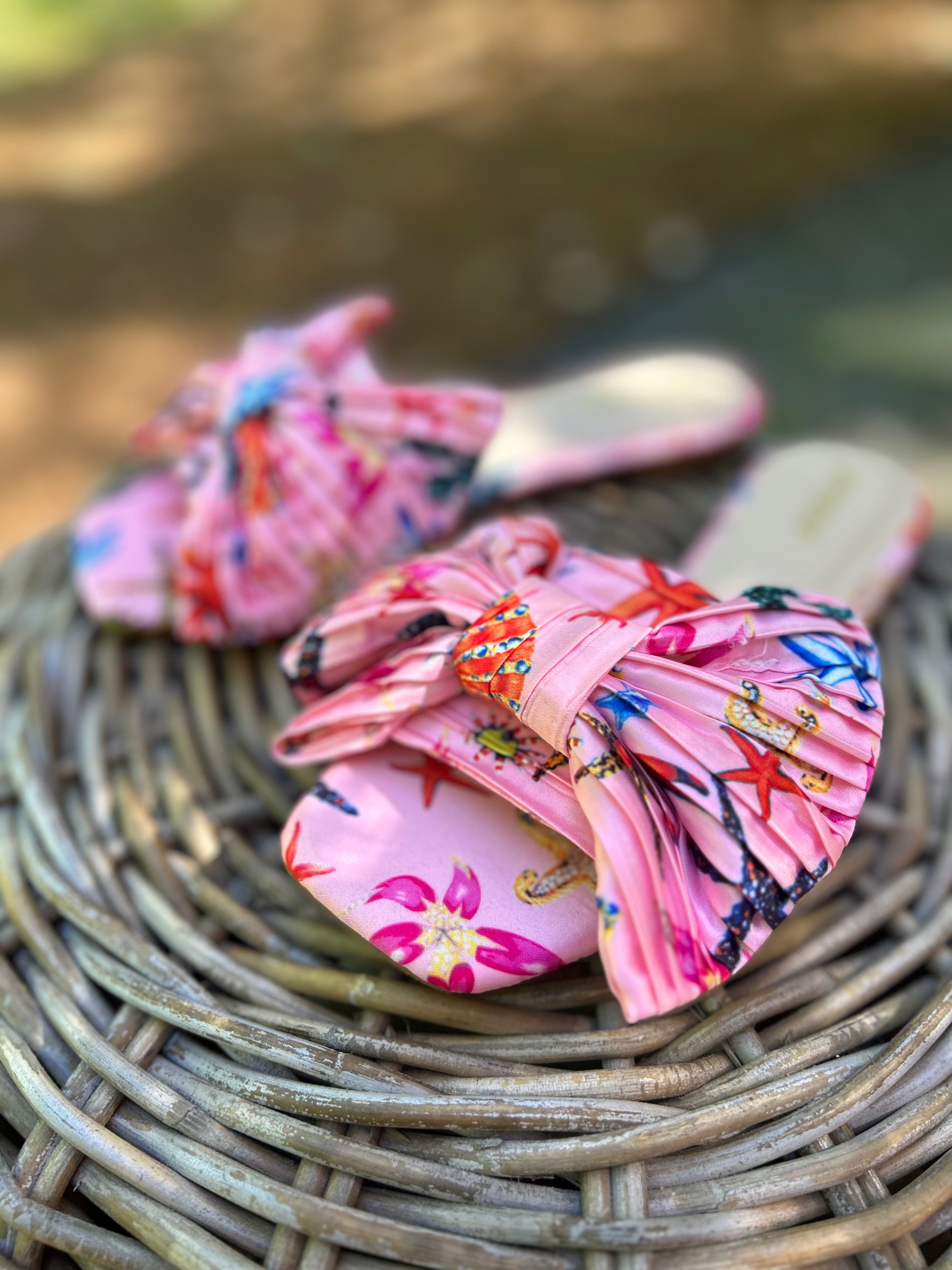 Sandals made with a pleated pink fabric featuring coastal symbols like fish and starfish. Perfect for your next trip to the beach!