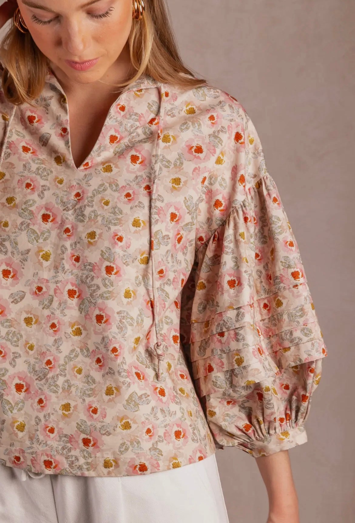 This cotton peasant blouse features a relaxed silhouette with a charming knotted string neckline and an allover print for a soft, feminine touch.