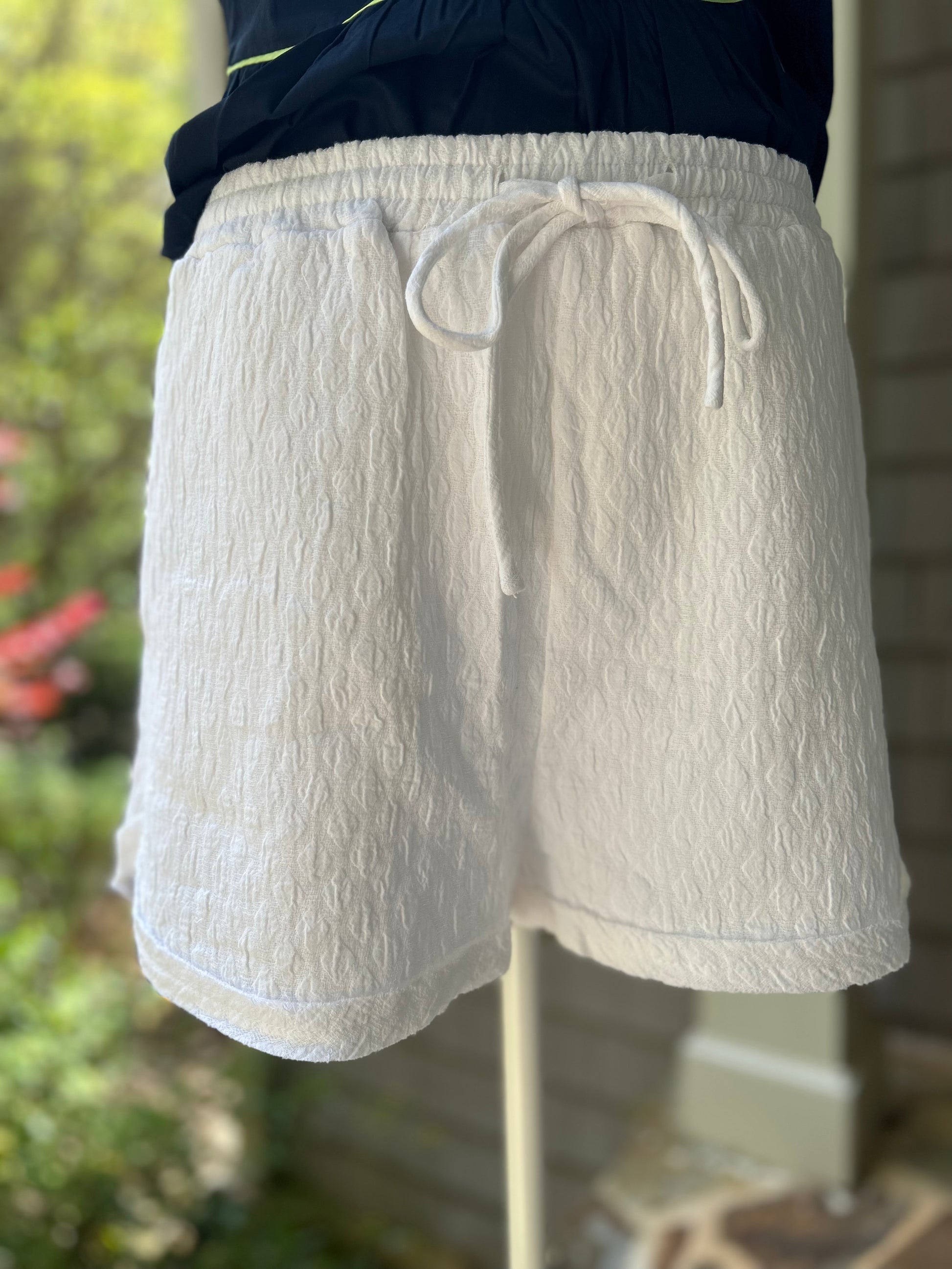 Elastic waist with an adjustable tie. Side pockets. Textured optic white shorts with a raw edge hem. The perfect spring/summer white short. Pair with our raw edge sleeveless top for a cute set!