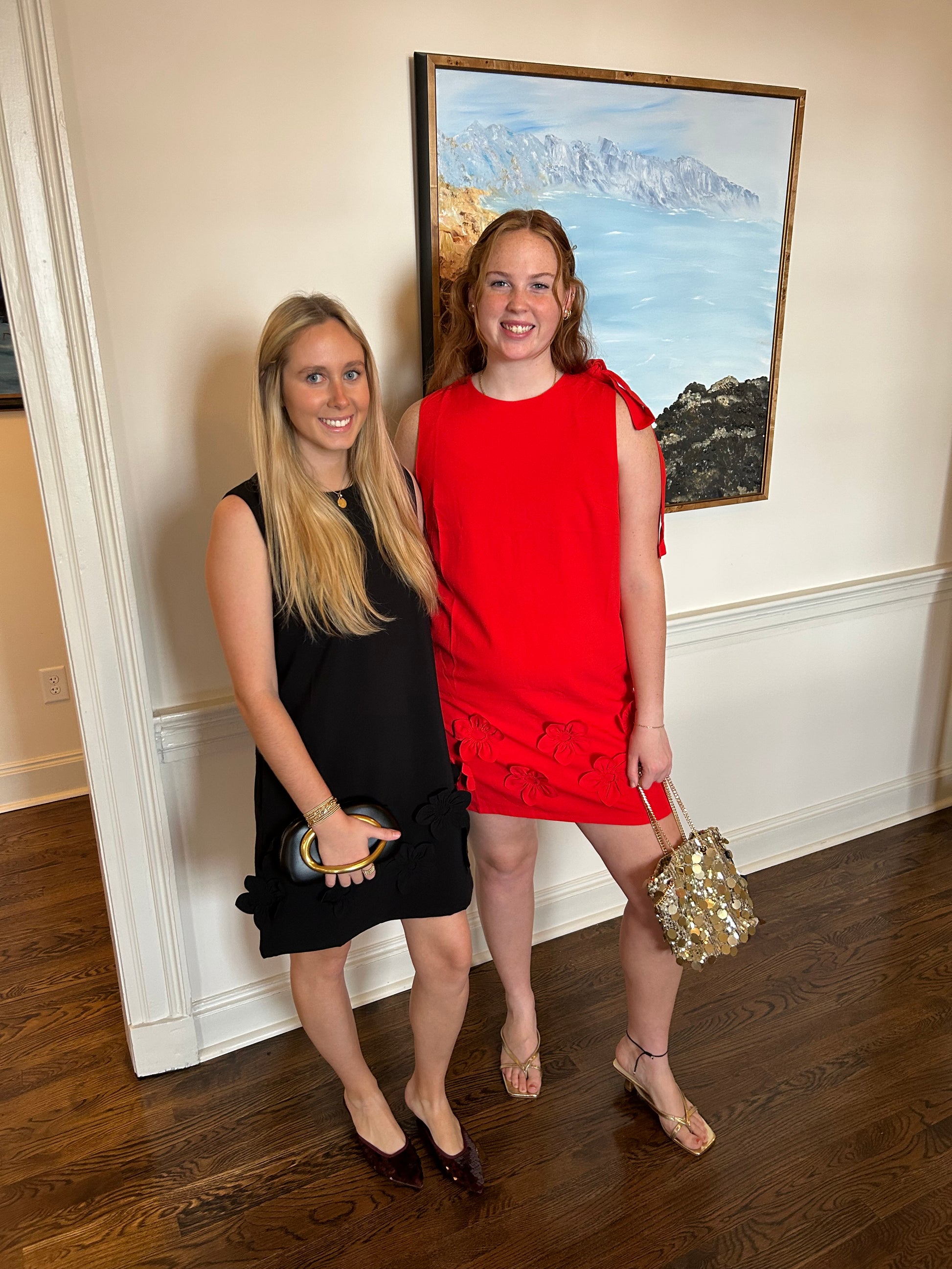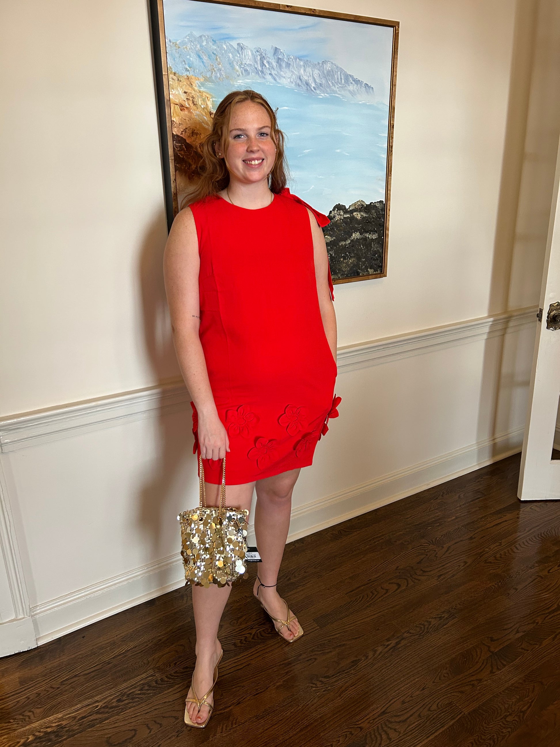 A great dress for your next special occasion! Bow detail at left shoulder, side pockets, back zipper. Lined. Flower detail at bottom hem.
