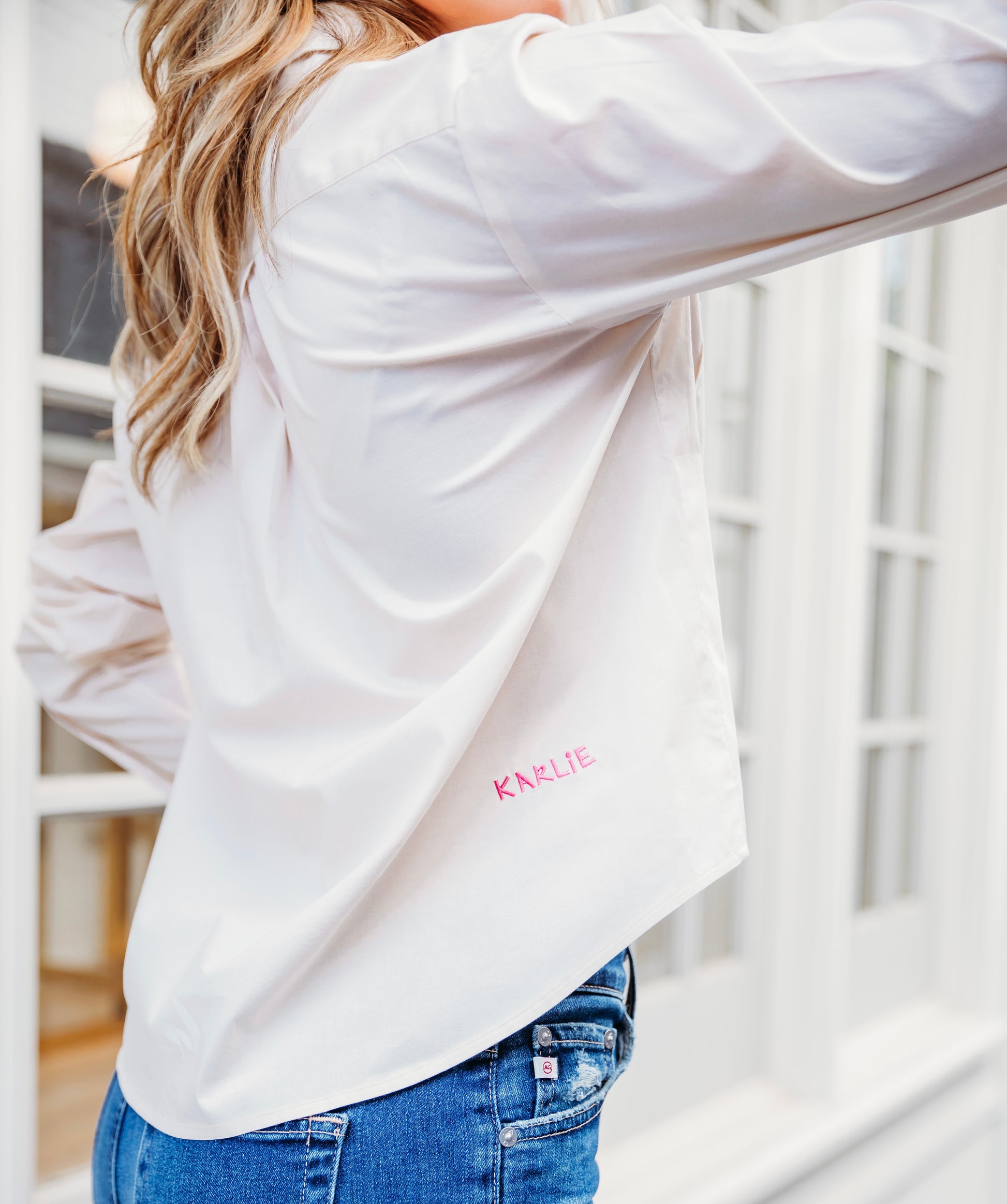 Classic meets modern with this Karlie button-down. Designed with a crisp collar, double front pockets, and a relaxed fit, it’s polished yet easy to wear. The subtle pop of pink Karlie embroidery on the back hem adds a fun signature touch, making this staple top anything but basic.