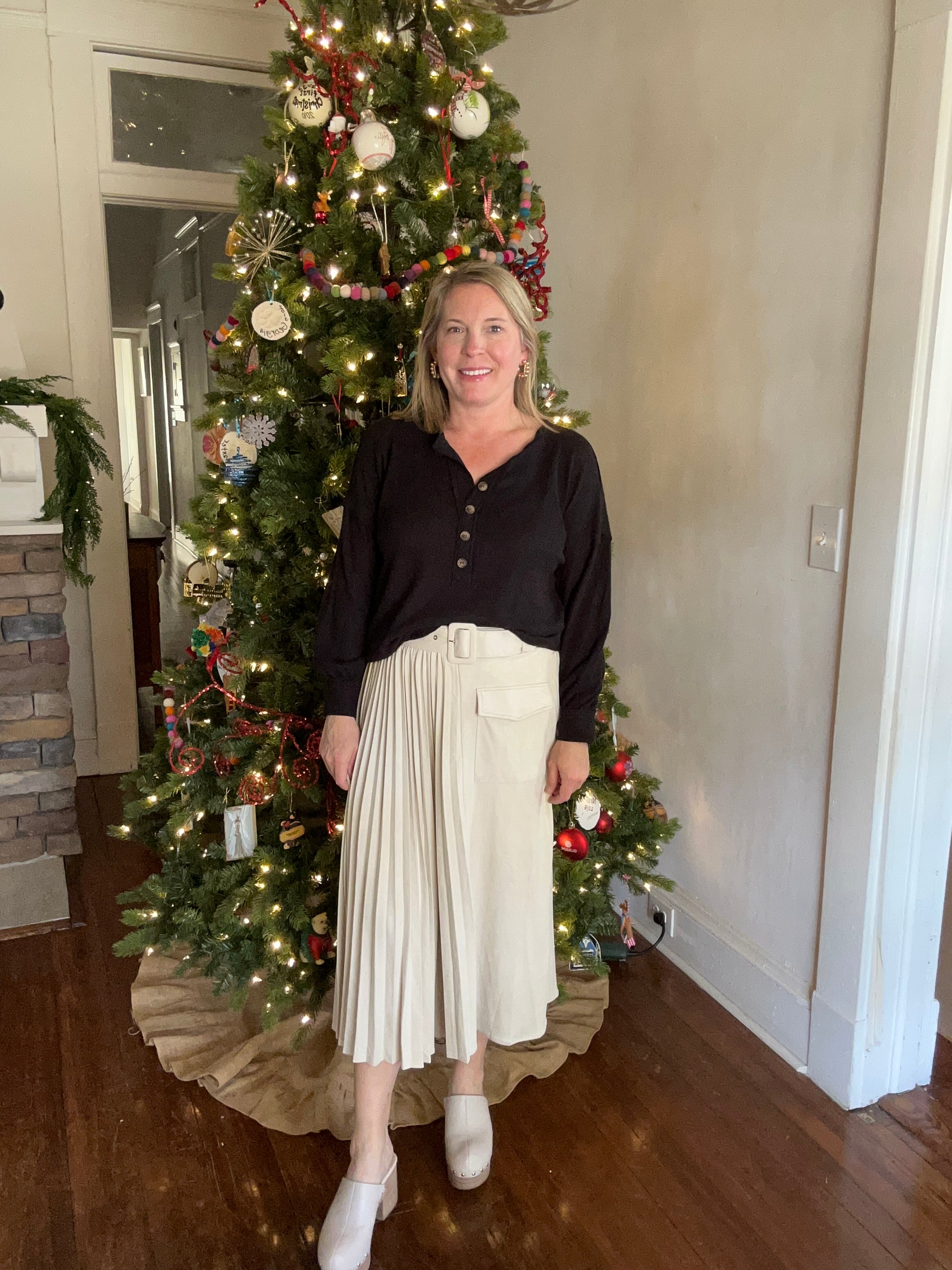 Beautiful pleated skirt in Ecru! Soft suede like material. Belted skirt with a side pocket. Does have a side zipper with hook and eye closure. Elastic around the back of the skirt. Pair with your favorite sweater and boots. Leslie is wearing a size large.